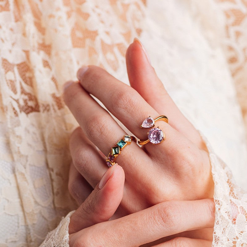 De iXXXi-ring Fame Precious Rose is een single ring en is gemaakt van stainless steel. Het ontwerp is strak en glad, met bovenop twee verschillende stenen: één in een ronde vorm en de andere in een elegante druppelvorm.