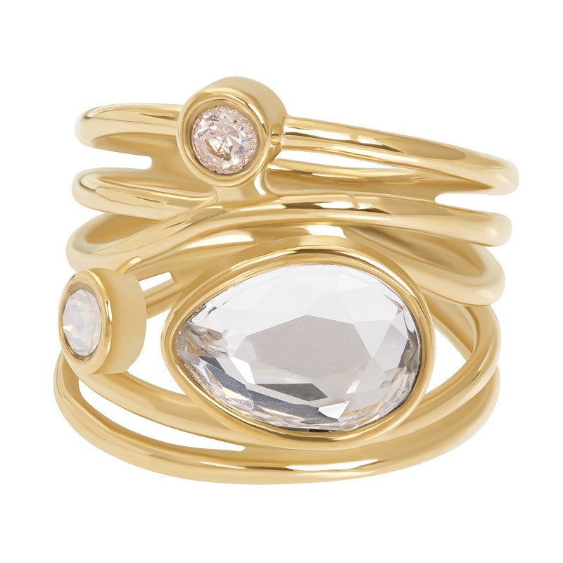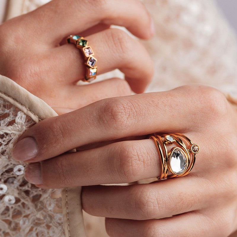 De iXXXi-ring Fame Bloom Opal is een single ring en is gemaakt van stainless steel. Het ontwerp bestaat uit een aantal dunne ringetjes langs elkaar met bovenop drie verschillende stenen: twee kleine ronde steentjes en één grotere steen in een elegante druppelvorm.