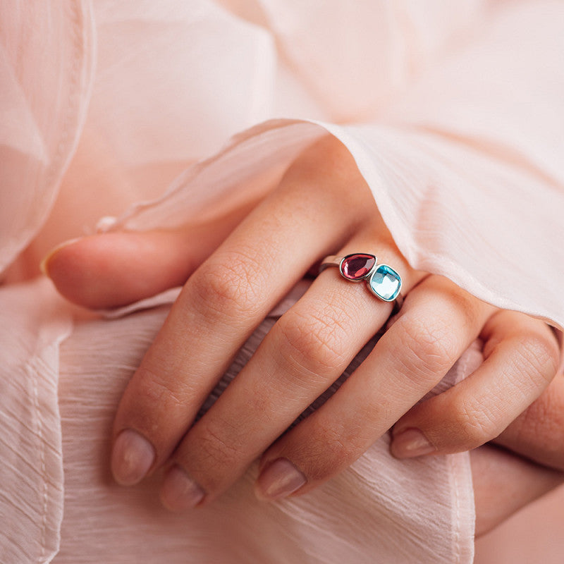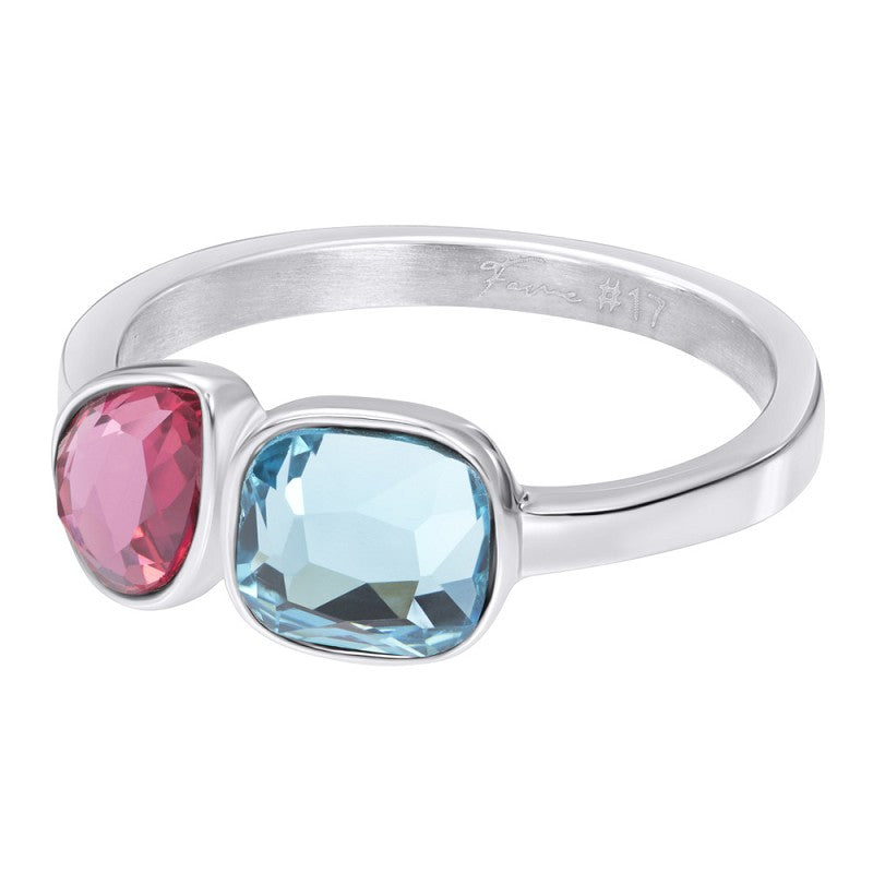 De iXXXi-ring Fame Hyacinth Aqua is een single ring en is gemaakt van stainless steel. Het ontwerp is strak en glad, met bovenop twee verschillende stenen: één blauwkleurige in een vierkante vorm en een rozekleurige in een elegante druppelvorm.