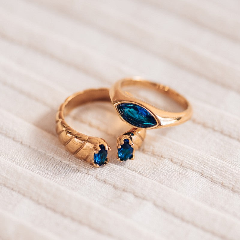 De iXXXi ring Fame Jolie Capri Blue is een brede single ring en is gemaakt van stainless steel. De ring bestaat uit een glad design met zegel op de voorzijde die is ingelegd met een grote blauwkleurige steen.