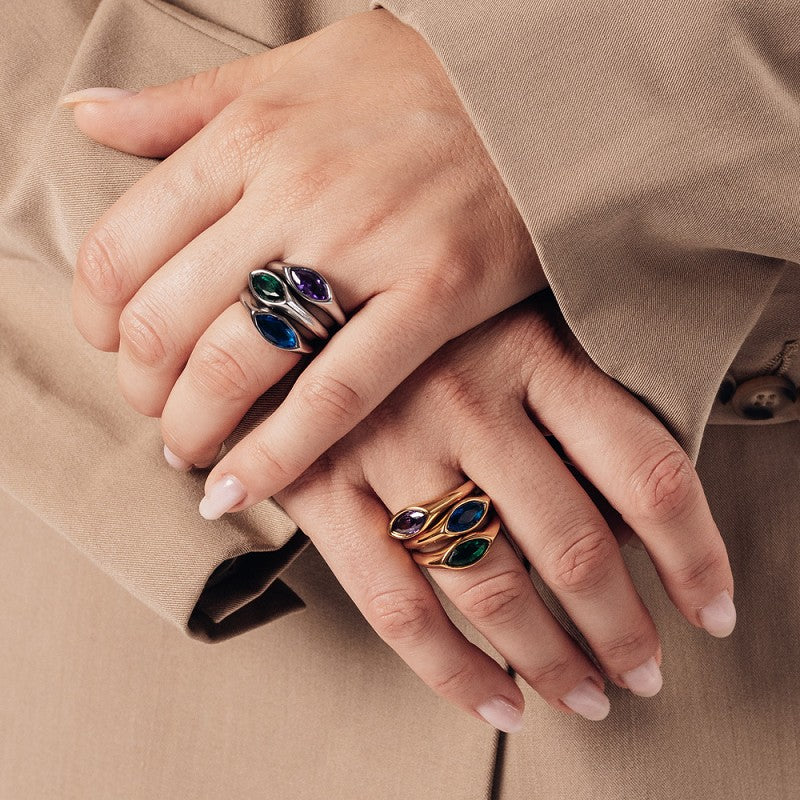 De iXXXi ring Fame Jolie Emerald is een brede single ring en is gemaakt van stainless steel. De ring bestaat uit een glad design met zegel op de voorzijde die is ingelegd met een grote groenkleurige steen.