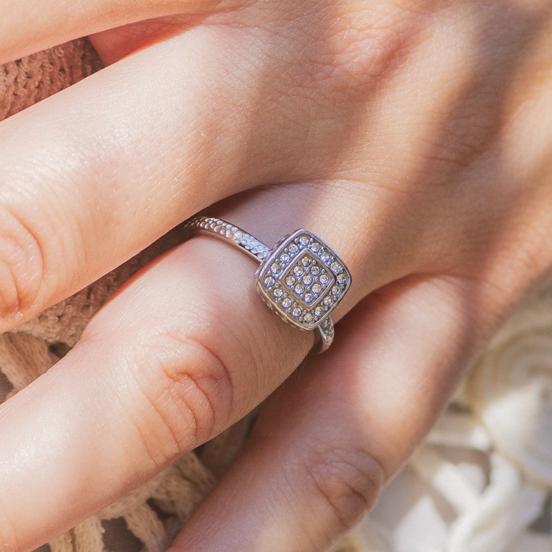 De iXXXi ring Fame Sense is een 2mm brede single ring gemaakt van stainless steel. De ring is voorzien van twee rijen met kleine inkepingen en heeft bovenop een vierkante vorm die volledig is ingelegd met zilverkleurige zirconia's.