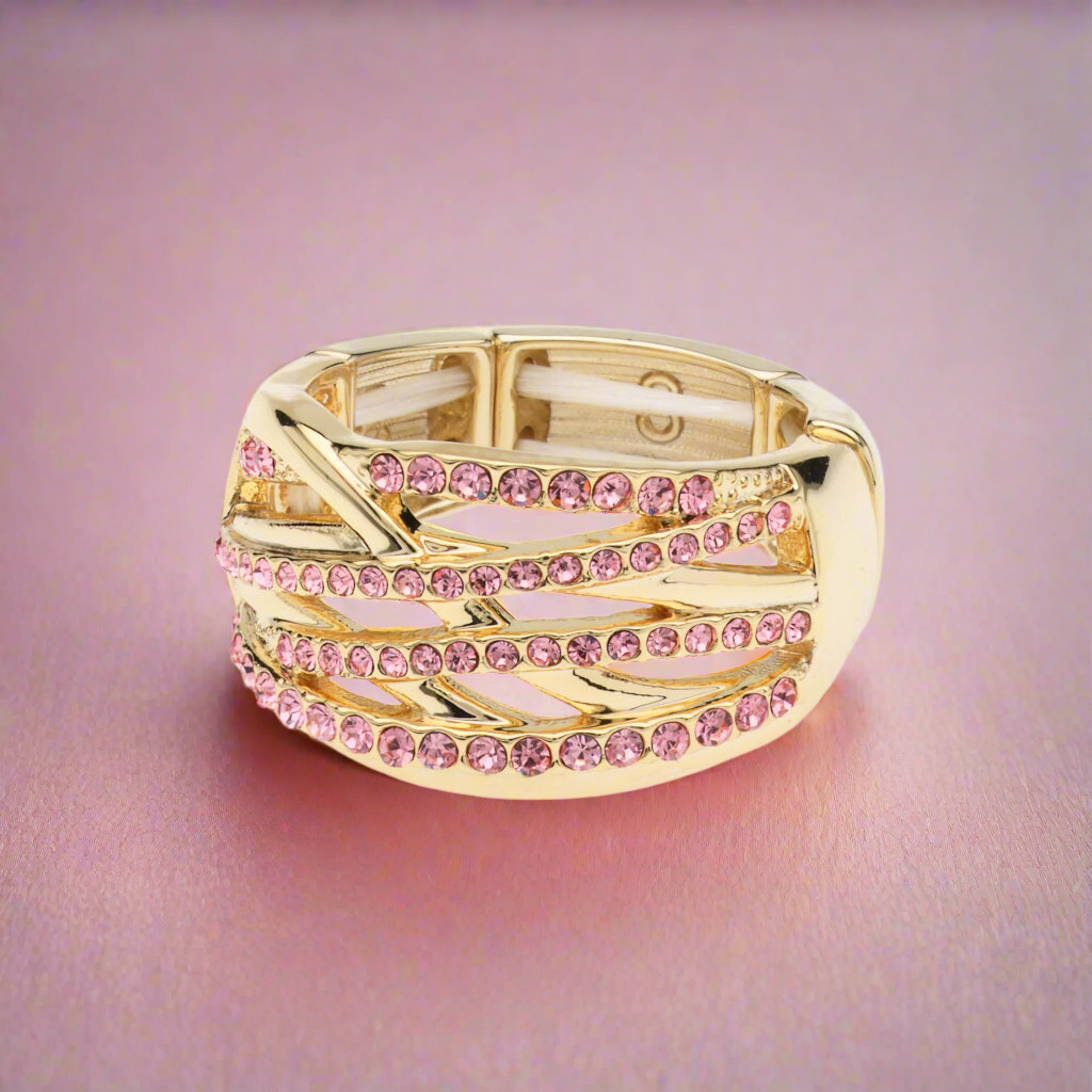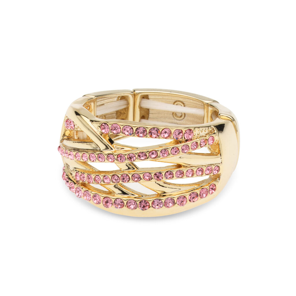 Goudkleurige elastische fantasie ring met roze steentjes BEjewels