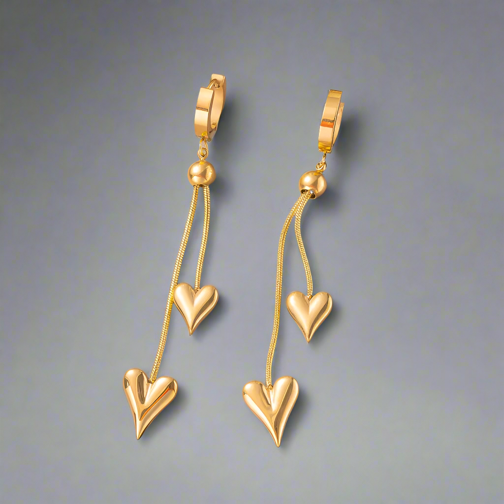 Deze lange goudkleurige hartenoorbellen glinsteren prachtig in je oren. Stijlvol en veelzijdig , perfect voor zowel casual als Chiqeu outfits.