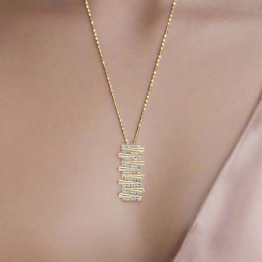 Deze prachtige langwerpige ketting is een echte blikvanger. Het verfijnde ontwerp, gecombineerd met sprankelende strass steentjes en goudkleurige accenten, geeft de ketting een verassend luxe uitstraling. Deze is een lust voor het oog ook mooi als set te dragen maar ook zeker apart.