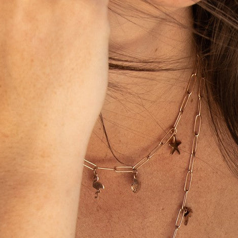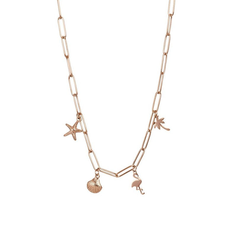De iXXXi halsketting with bedels is gemaakt van stainless steel en is voorzien van een rosé goud- of zilverkleurige plating. De ketting bestaat uit een grove schakel en is voorzien van verschillende paradijselijke symbolen zoals een palmboom, een flamingo, een zeester en een