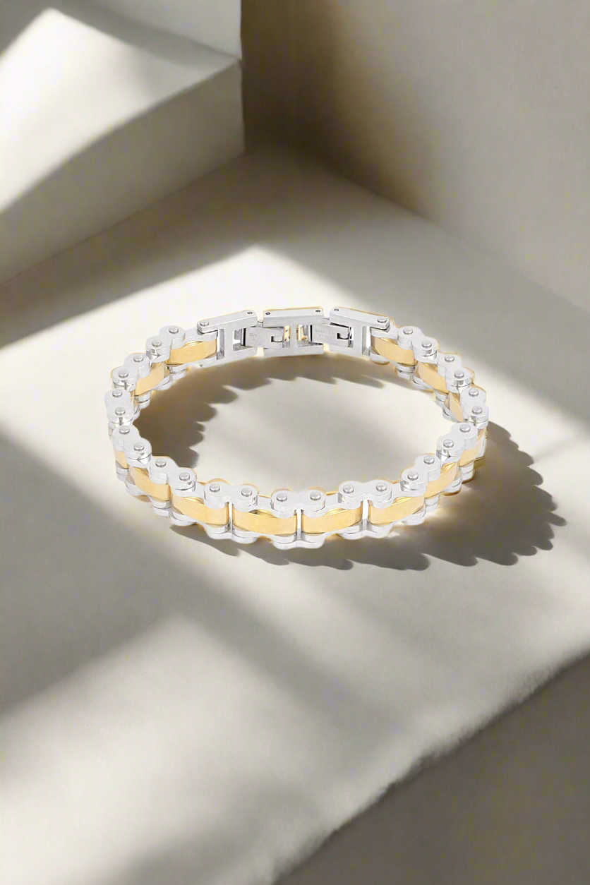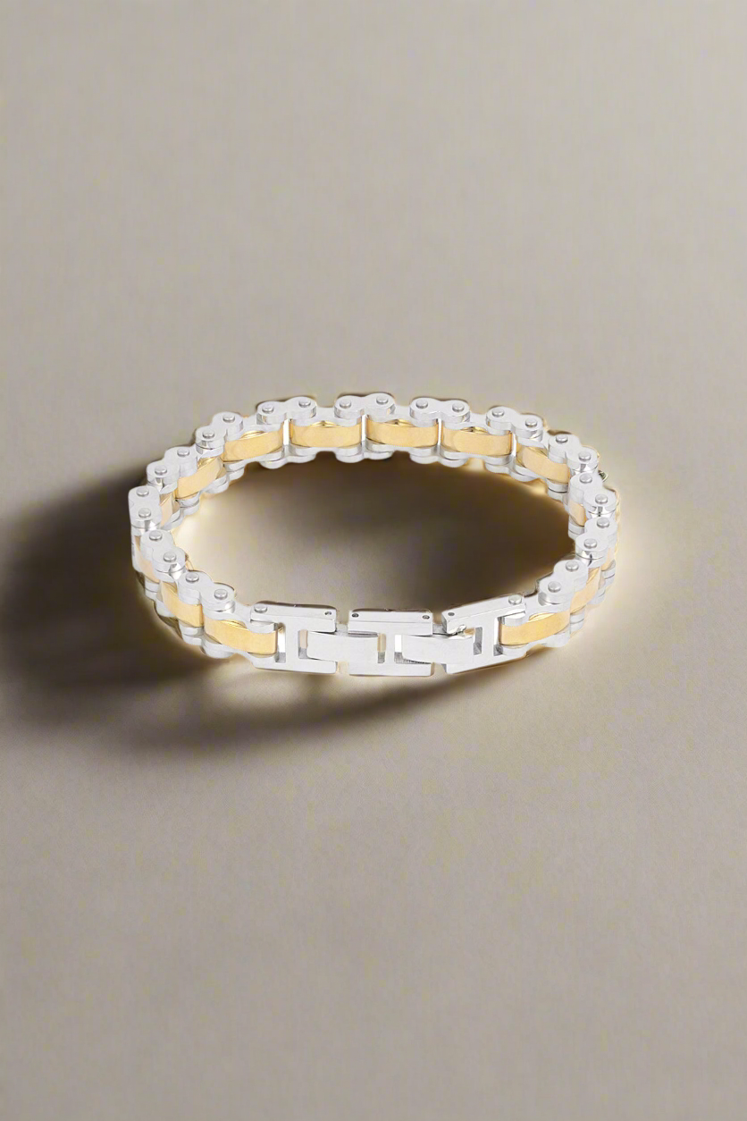 Deze heren zilverkleurige armband met goudkleurig accenten is een stijlvolle en geweldig accessoire, ontworpen voor de Moderne man. Deze armband word zowel casual als chique gedragen.