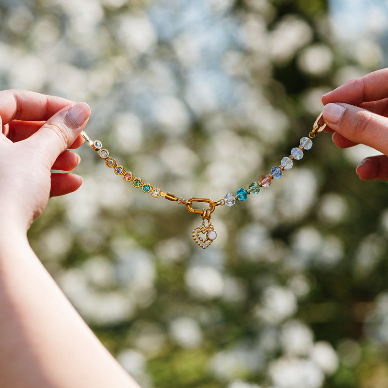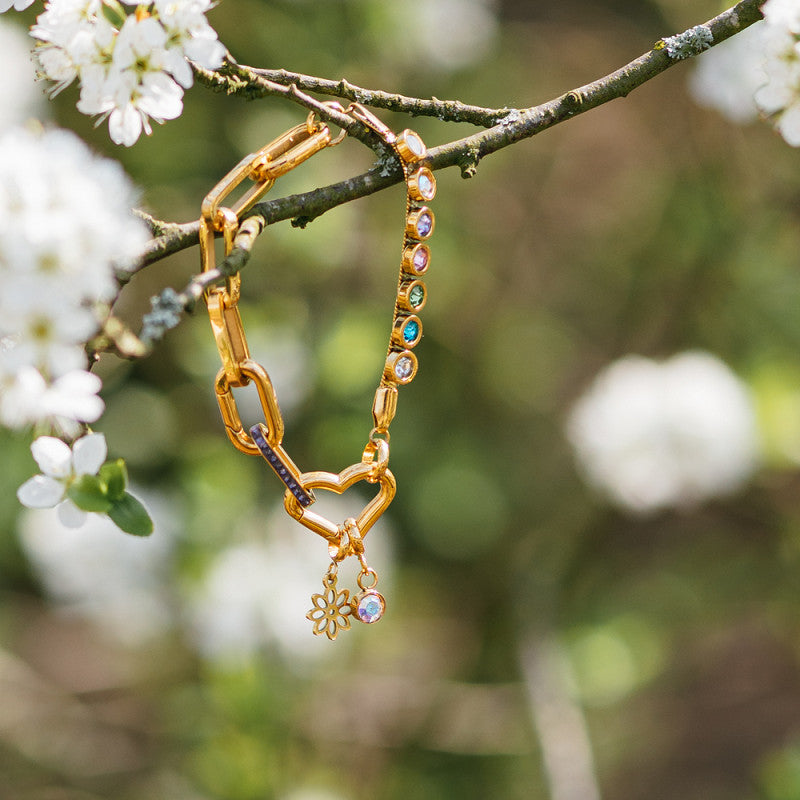 De ketting Britta Blossom sieraad van iXXXi Connect bestaat uit een fijne, platte schakel gemaakt van stainless steel. Op deze streng zijn ronde vormen bevestigd die zijn ingelegd met verschillende pastelkleurige steentjes.