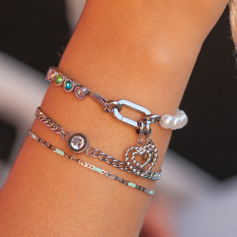De ketting Britta Blossom sieraad van iXXXi Connect bestaat uit een fijne, platte schakel gemaakt van stainless steel. Op deze streng zijn ronde vormen bevestigd die zijn ingelegd met verschillende pastelkleurige steentjes.