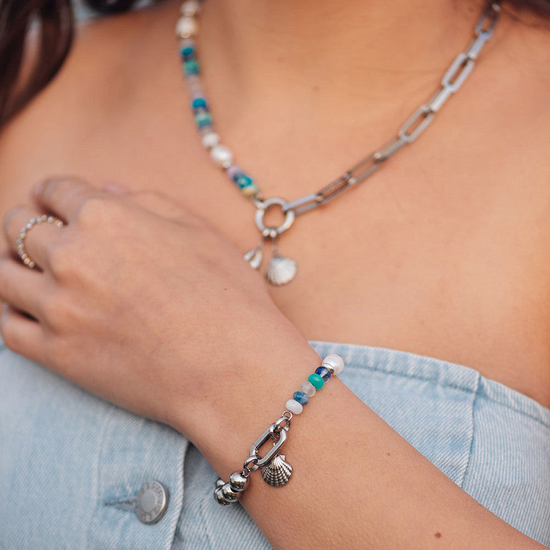 De iXXXi Connect Ketting ‘Ibiza’ is een zomerse ketting welke bestaat uit multicolor steentjes met in het midden een opvallende parel. Aan elk uiteinde van de ketting is een schakel bevestigd welke is gemaakt van stainless steel. De ketting ‘Ibiza’ is één van de sieraad onderdelen uit de iXXXi Connect collectie waarmee je je eigen sieraad kunt samenstellen.