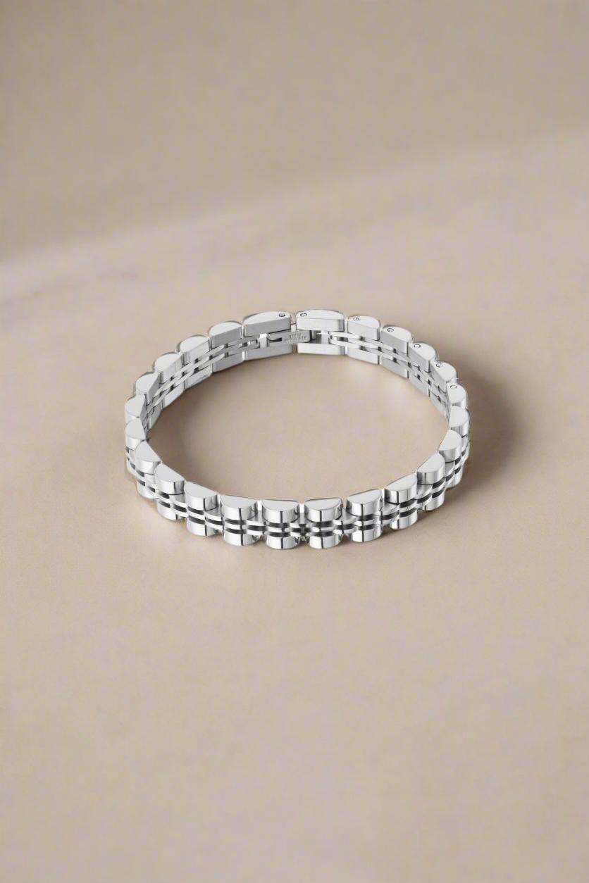 Deze drie varianten kleuren minerale schakelarmband heeft een strakke, moderne uitstraling. Gemaakt van duurzaam roestvrij staal, biedt het een luxe uitstraling met stevige schakels en een klassieke sluiting. Perfect voor elke gelegenheid.